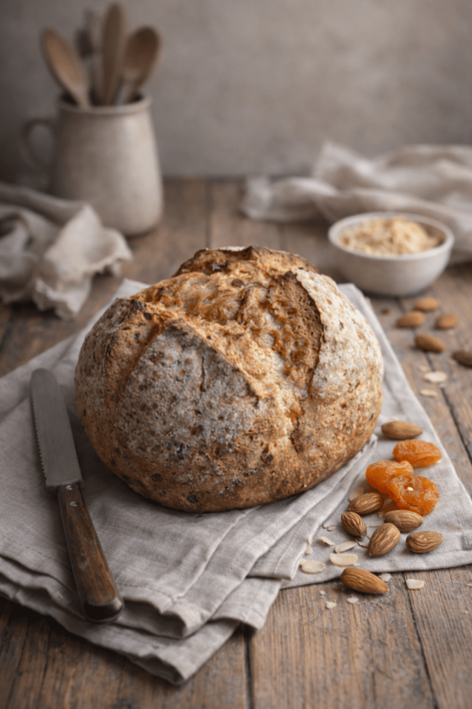 Pan sin gluten número 42 de 50: Pan de orejones y almendras. La receta completa en mi futuro libro 50 panes sin gluten.